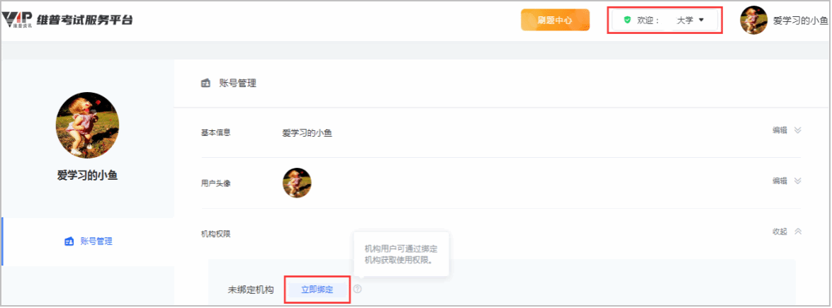 (2)按提示绑定机构权限,或在“个人中心”内进行手动绑定。个人账号绑定机构权限后不受IP登录限制,享有学校订购的所有模块和平台提供的完整学习服务。